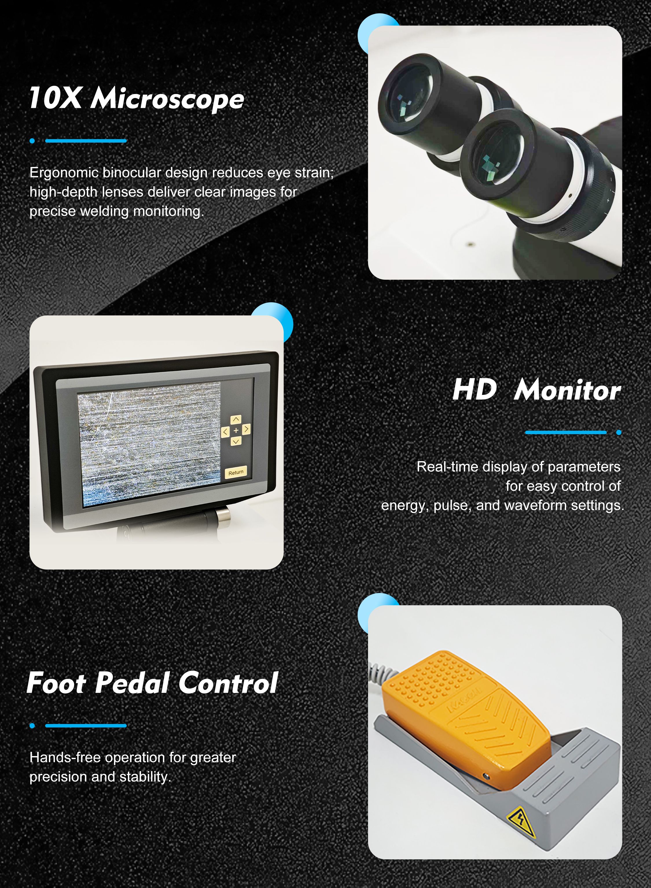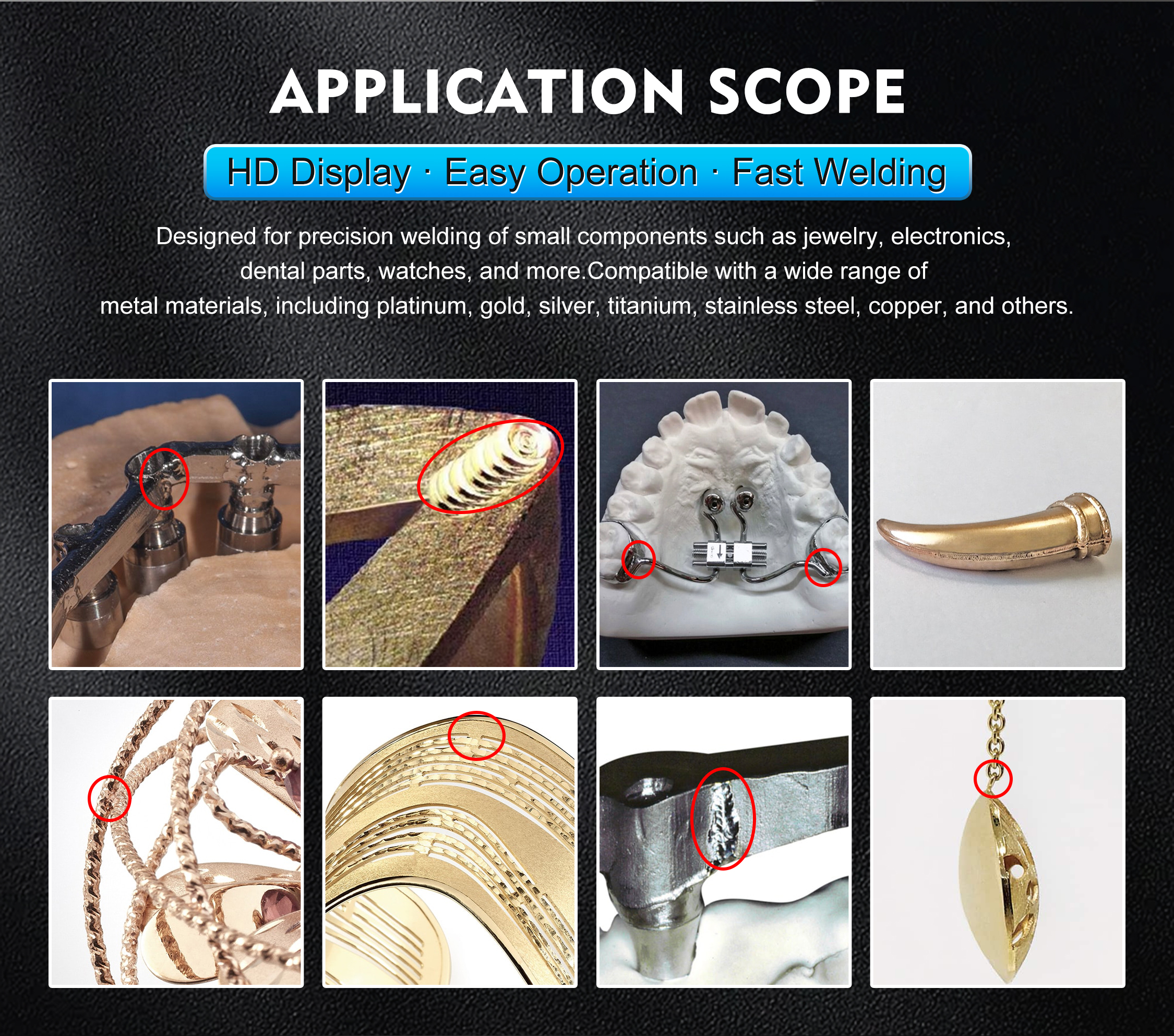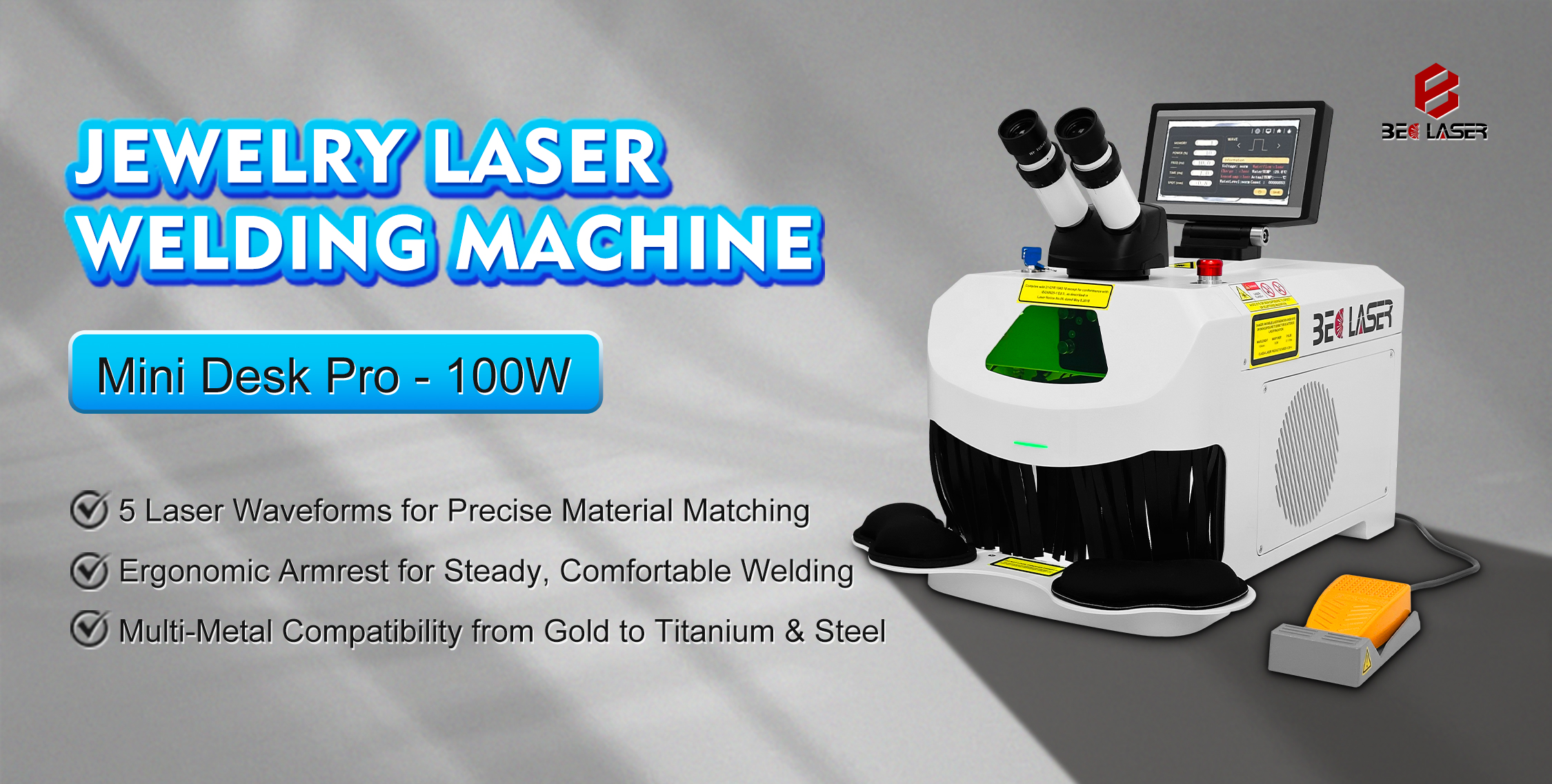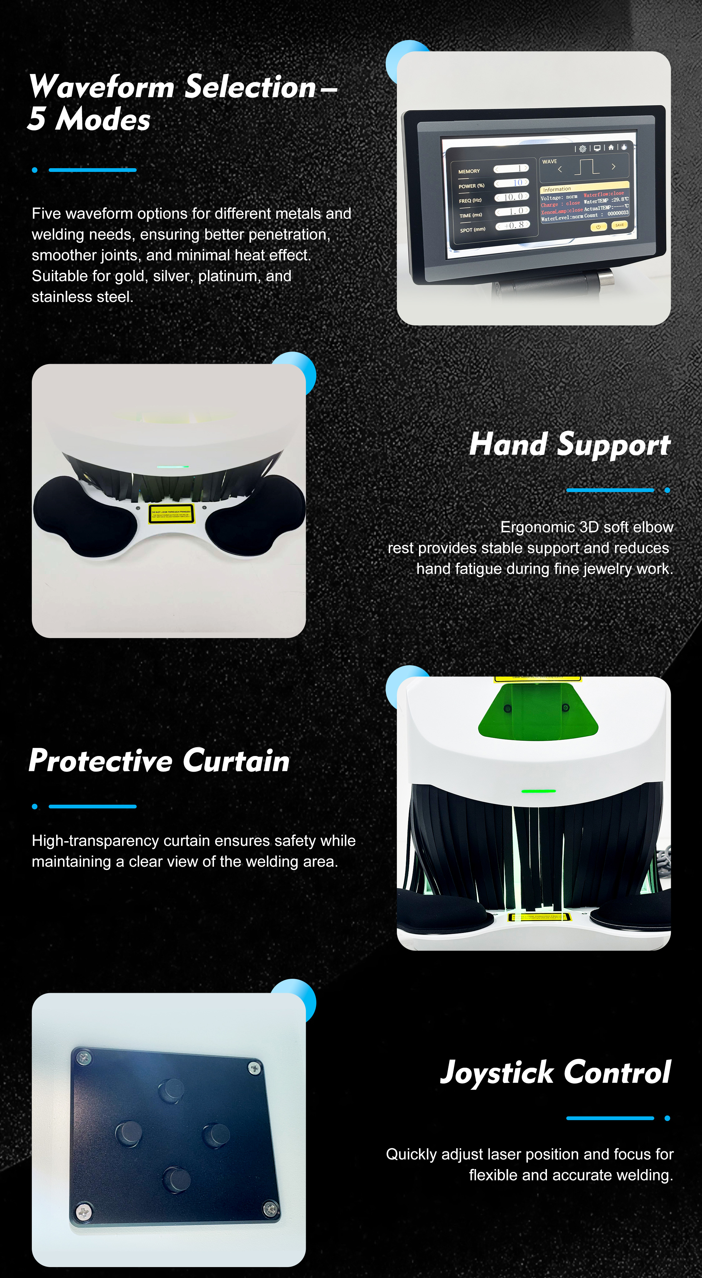 Engineered for Precision, Comfort, and Versatility.With 5 programmable laser waveforms, this welder adapts toeach material for flawless results. The ergonomic armrestguarantees stable and comfortable operation. Achieveexcellence across a broad spectrum of metals, fromprecious to industrial grades.